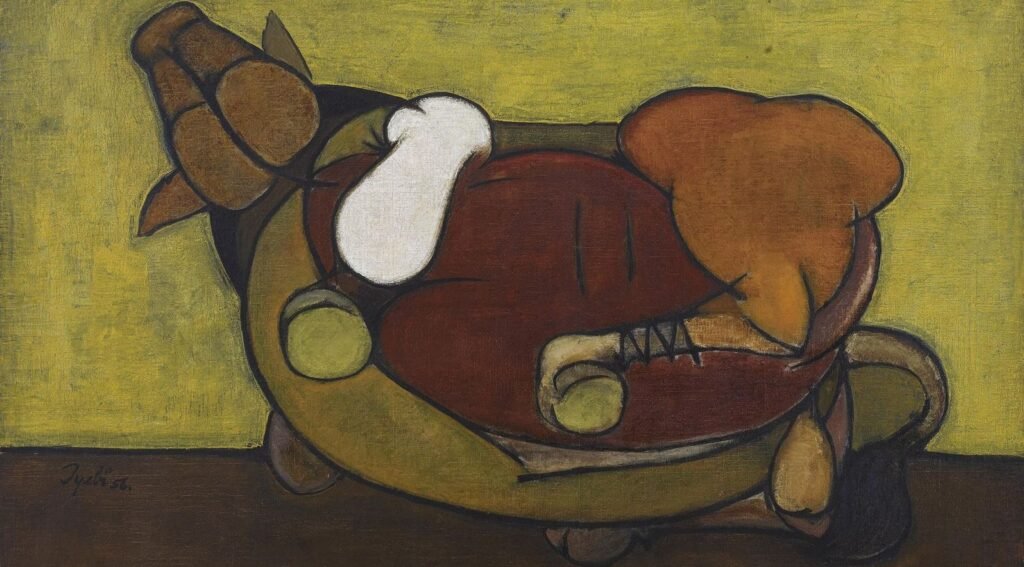 As a response to the socio-political turmoil surrounding the demolition of the Babri Masjid and the Mumbai riots, Tyeb Mehta’s “Wounded Tiger” is a compelling artistic work. This painting is a poignant metaphor for a nation torn apart by communal tensions, created during a tumultuous period. The central focus on a wounded tiger in Mehta’s work is symbolic, representing collective pain and suffering of a society in crisis. The choice of a powerful and majestic animal underscores how serious the issues are. Tigers are wounded during this tumultuous period in Indian history, reflecting the wounds inflicted on the nation’s identity and harmony.