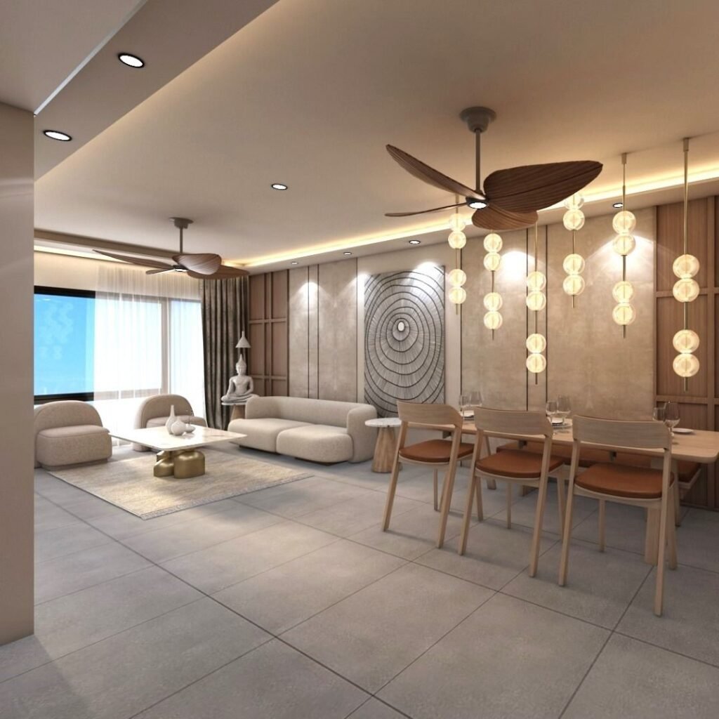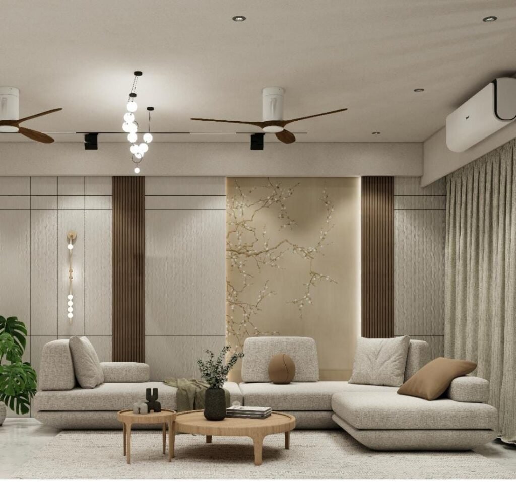 Upgrade the look of your ceiling with beautiful geometric patterns, combining two fans for a modern, stylish element. This doesn’t only make it look good; it ensures perfect airflow, serving both functionality and style. Geometrical figures create balance and beauty through symmetry, thus they can ensure a trendy environment that matches various types of interior designs. A nicely crafted ceiling with built, in fans can definitely give your living room an extra touch of style, regardless if you like your shapes bold or patterns toned down. This method is suitable for contemporary residences and it combines functionality with artistic creativity, so the result is a more comfortable as well as aesthetically attractive home.