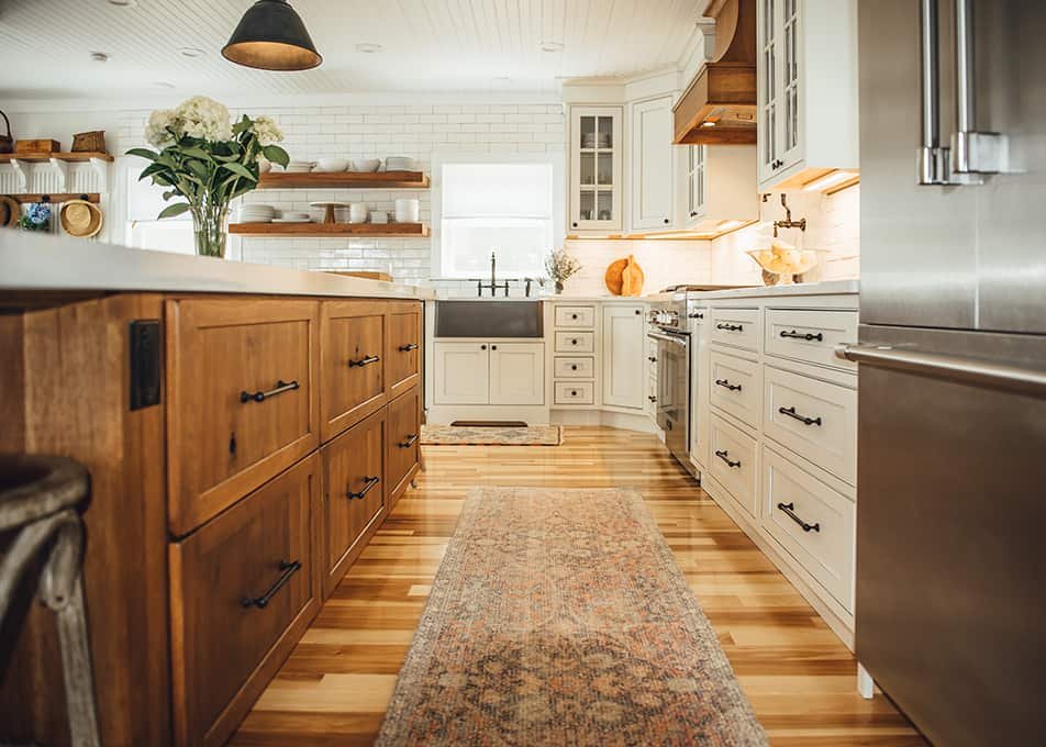 This farmhouse kitchen has a white wooden island with beige countertops that further enhance the classic design, while the white corbels support the structure itself. Light wooden stools tuck under the island itself, facing bay windows that further brighten the kitchen space. Moreover, basically, you can make your kitchen look the same style by adding matching wood panels or simple decorative borders on the island ends for a complete, finished appearance. We are seeing that end panels with painted finishes, wood touches, or pattern designs give a simple but good way to make style and use better, making your farmhouse kitchen stand out only.