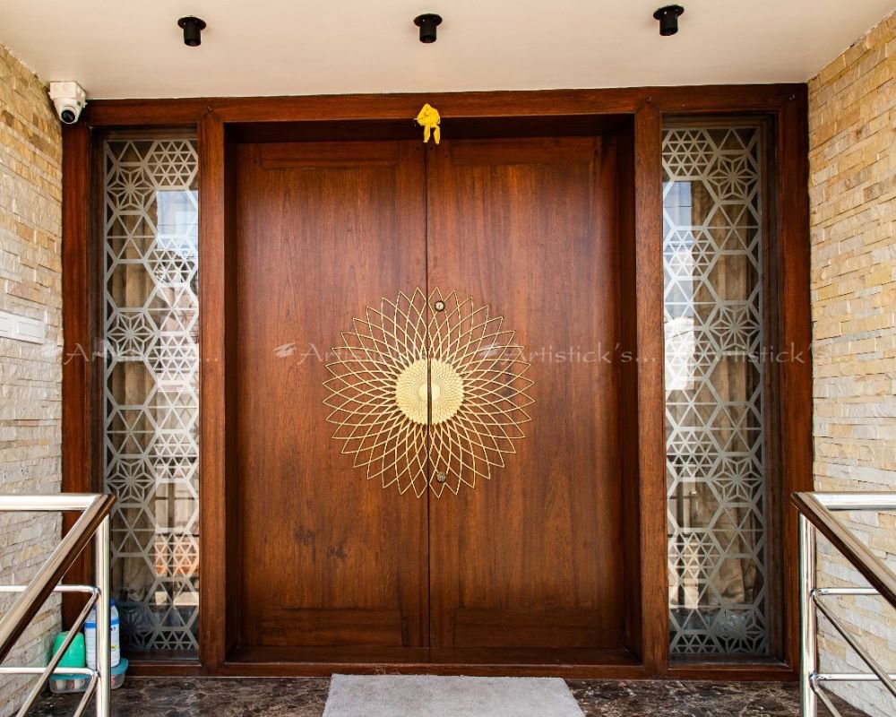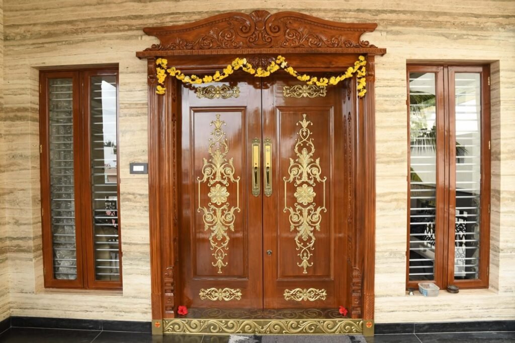 This Indian main door design is inspired by the old art of carving and uses patterns that are hand-carved and can be of a floral style or of a temple. These fanciful door patterns are frequently made of teakwood and adorned with gold or a natural shine. They provide homes a cultural touch, which makes them suited to villas or bungalows with a traditional theme.