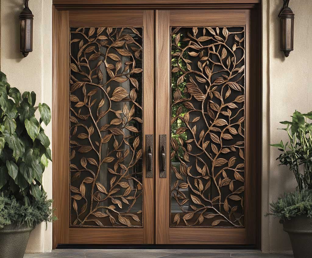 This is a home door design, which is inspired by nature, and with the design of leaf-shaped, this design softens and adds elegance to your door. You may paint the leaves to be green, gold or maintain the same colour as the gate to create some slight effect. It entirely lies in your taste and preference. This style is appropriate in homes that have gardens and provide an entrance of a relaxing and inviting atmosphere.