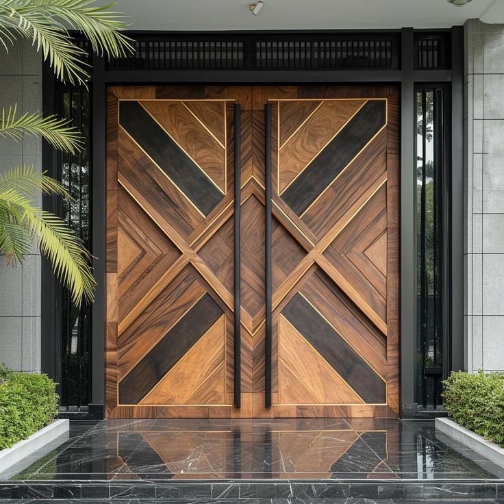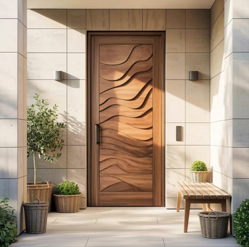 Who doesn’t enjoy a front entrance that stops them in their tracks? Clean triangles framing frosted glass or hexagons engraved in warm wood are examples of geometric main entrance modern door design that combine strong shapes and sharp angles to create something new and welcoming. By testing with light and shadow, they gently greet guests while adding an updated edge without much effort. These patterns are ideal for little houses since they scale easily, making your entryway a timeless and visually unique statement.