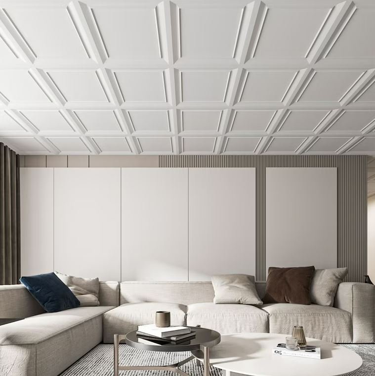 Coffered fall ceiling design is a type of construction in which there are recessed panels in a grid which creates depth and architectural beauty. This traditional style will beautify halls, and giving them a grand look, with a clean line, and slight shadows. It would be perfect in modern or classic interior since it creates a sense of space easily.