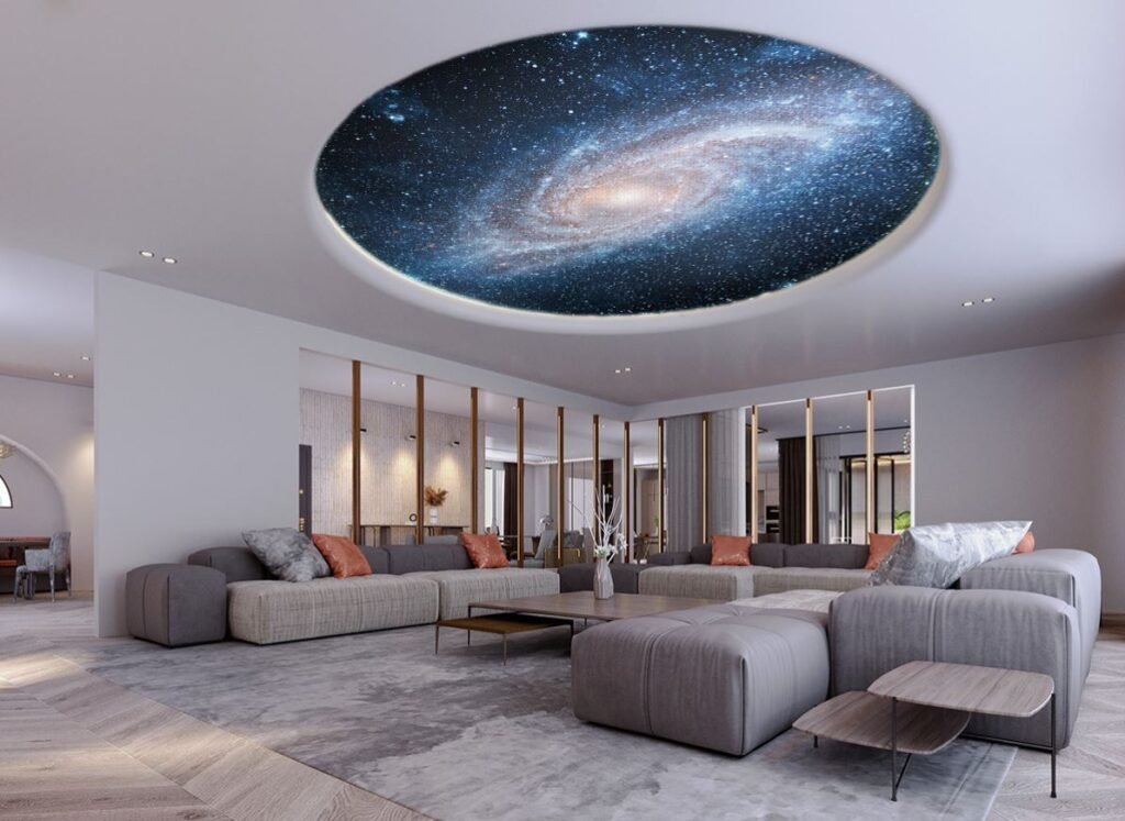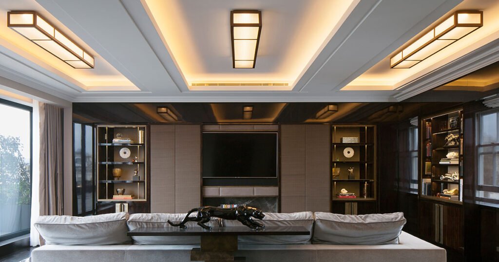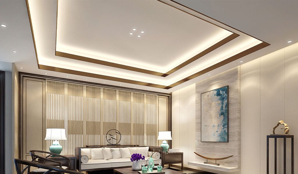 It features a mixture of classic decor with modern luxury elements, displaying a flowering lotus decoration of an exquisite crystal chandelier centrepiece. The effects of LED strips used are gradient lighting which contributes to the dimensional quality of the ceiling design. This high-tech style makes the large living halls look like a stylish entertainment parlor with its dramatic and sophisticated outlook.