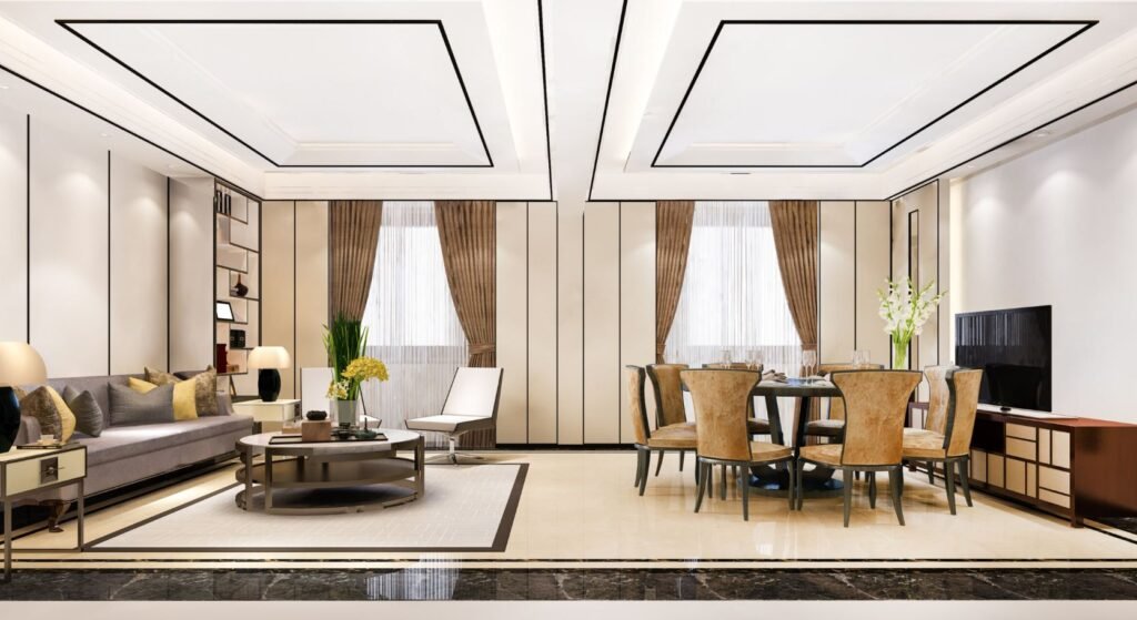 There are occasions when a large hall is too vacant or noisy. Thats where the Multi-zone hall ceiling dividers come in. Without creating walls, these are structures that are used to divide spaces. As a result, you have your own areas to relax, eat, or work. So you see when you enter the room the ceiling is like a guide to you. A part of your hall yields to yet another. The layout is intentional, and it is possible to experiment with materials.