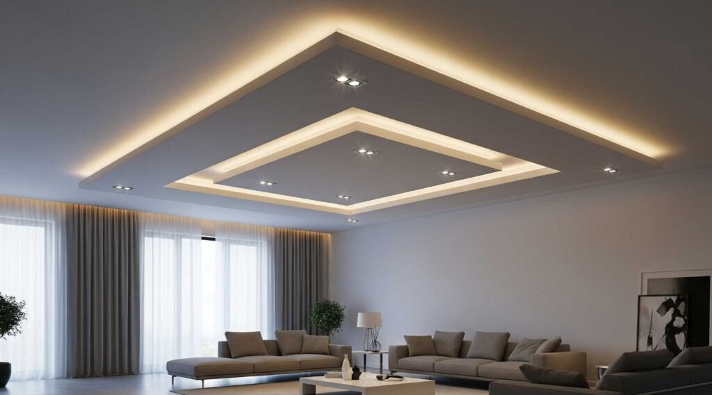 Be out of one thing and be in another. The use of hall modern ceiling design with elements incorporated gives your space creativity and personality. Suppose wood, and gypsum, and even a mere bit of metal should unite in one roof. It is lighthearted, contemporary, and original. You can create patterns, layers, or play with slight contrasts. For instance, you may decide to put some hidden LED strips along the edges or panels. As the light changes, so does the hall.