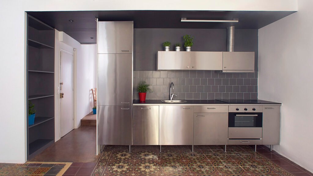 Stainless steel that was used in the kitchen makes the room look very trendy and fashionable to a small space small modular kitchen design. It has smooth and silvery shine where the surrounding environment is reflected and makes the space appear larger and more engaging and also its depth is more.