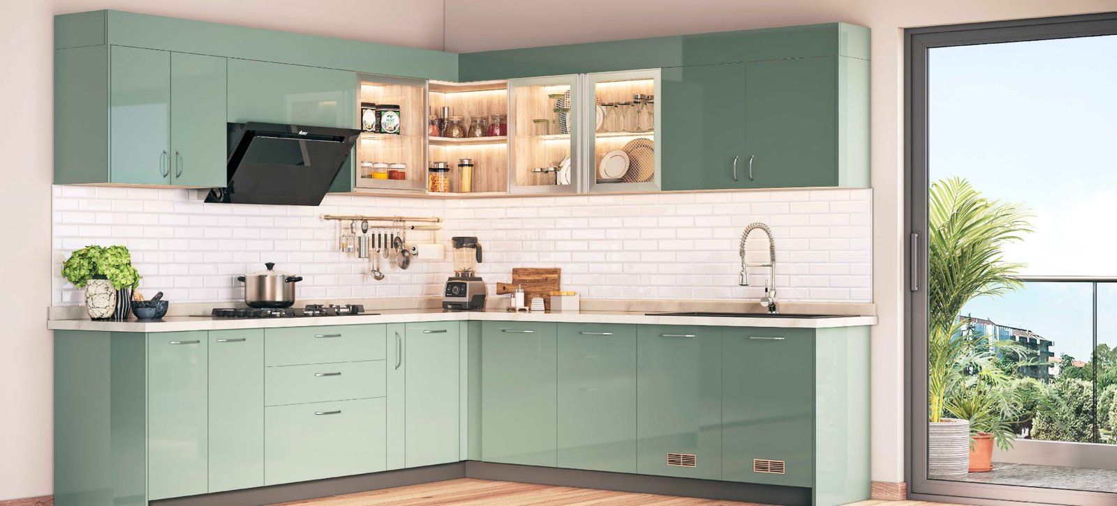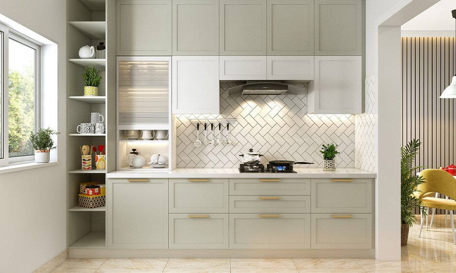 Glass-front cabinets would be suitable in a small kitchen as they make it open and airy and would also increase the illusion of space. They help to create visual depth that enables small spaces to look bigger and warmer by reflecting light. These cabinets also provide the ideal chance to display fancy crockery, sophisticated glassware, or selected items of your kitchen, which will also provide a decorative element to your interiors. Meanwhile they help in keeping all orderly, secured and available. Glass-front cabinets are efficient and contain a touch of beauty, which is regarded to be a ultimate combination of storage and beauty in the modern indian style small modular kitchen design world.