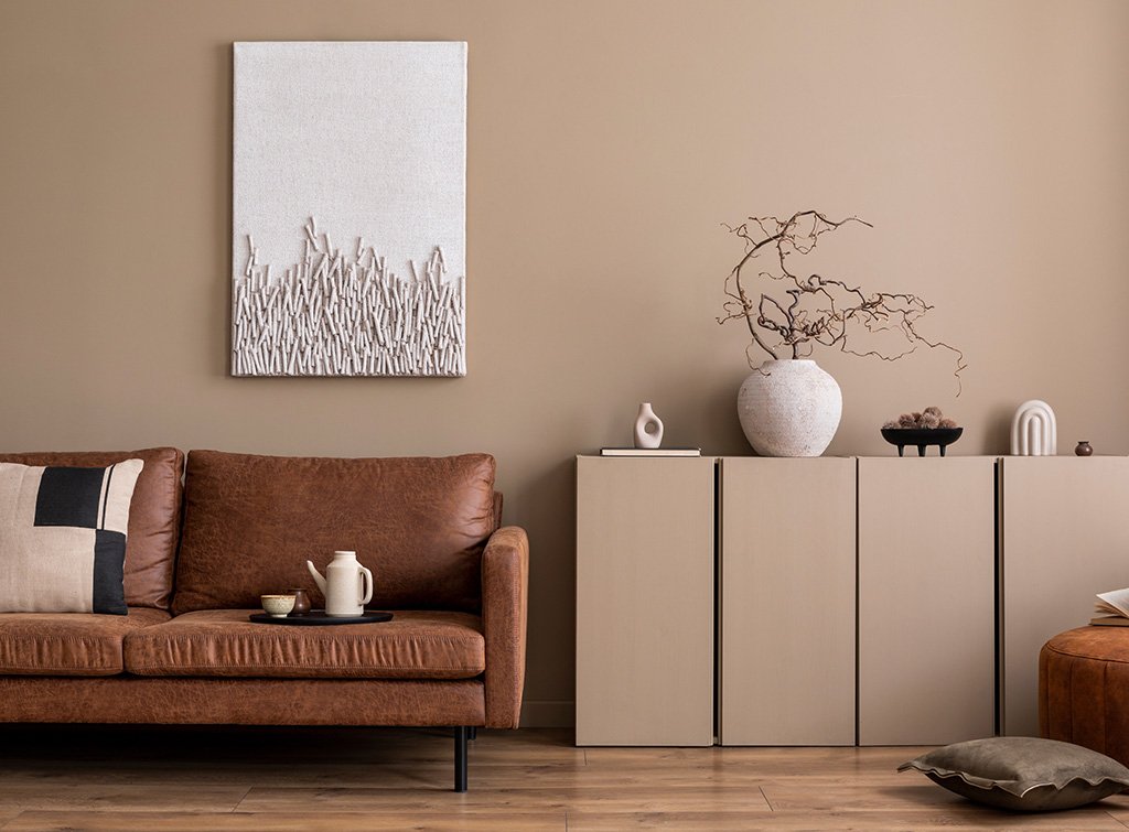 Mustard yellow, sage, earthy brown, and clay beige are becoming more and more popular to use as a neutral background for a peaceful living room or a sleeping bedroom. These sophisticated, warm colours bring a comforting softness and create a calming effect. These tones are perfect for both living rooms and bedrooms, as well as office spaces, to create a harmonious atmosphere. Such soft pastel tones work well with natural textures such as wood, linen, and jute, enabling you to add a contemporary and trendy yet comforting and timeless feel into the mix.